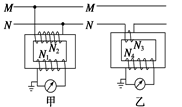 4、选择题 、如图所示,M、N为两条交流输电线,甲、乙两图是配电室中的互感器和交流电表的两种接线示意图,以下说法正确的是(?)