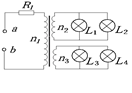 3、选择题 如图,理想变压器原、副线圈匝数 n1: n2 : n3 =" 3" : 2 : 1 ,副线圈 n2接有 “8V 8 W ” 的灯泡 Ll、L2,副线圈n3上接有 “6 V 9W ”的灯L3、L4.原线圈上接有电阻 R1 = 3