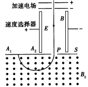 5、选择题 下图是质谱仪的工作原理示意图,带电粒子被加速电场加速后,进入速度选择器,速度选择器内相互正交的匀强磁场和匀强电场的强度分别为B和E。平板S上有可让粒子通过的狭缝P和记录粒子位置的胶片A1A2。平板S下方有强度为B0的匀强磁场,下列表述正确的是