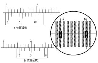 (2)已知双缝到光屏之间的距离是L=500mm,双缝之间的距离是d=0.50mm,单缝到双缝之间的距离是S=,某同学在用测量头测量时,调整手轮在测量头目镜中先看到分划板中心刻线对准A条亮纹的中心,然后他继续转动,使分划板中心刻线对准B条亮纹的中心,前后两次游标卡尺的示数如右图所示。示数依次为X1="__" __ ___