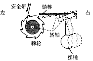 2、选择题 如图所示是一种汽车安全带控制装置的示意图。当汽车处于静止或匀速直线运动时,摆锤竖直悬挂,锁棒水平,棘轮可以自由转动,安全带能被拉动。当汽车突然刹车时,摆锤由于惯性绕轴摆动,使得锁棒锁定棘轮的转动,安全带不能被拉动。若摆锤从图中实线位置摆到虚线位置,汽车的可能运动方向和运动状态是
