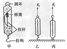 3、选择题 实验室常用的弹簧秤如图甲所示,连接有挂钩的拉杆与弹簧相连,并固定在外壳一端O上,外壳上固定一个圆环,可以认为弹簧秤的总质量主要集中在外壳(重力为G)上,弹簧和拉杆的质量忽略不计,现将该弹簧秤以两种方式固定于地面上,如图乙、丙所示,分别用恒力F0竖直向上拉弹簧秤,静止时弹簧秤的读数为?
