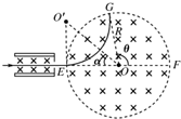 5、简答题 图中左边有一对平行金属板,两板相距为d,电压为U,两板之间有匀强磁场,磁感应强度大小为B0,方向与金属板面平行并垂直于纸面朝里.图中右边有一半径为R、圆心为O的圆形区域,区域内也存在匀强磁场,磁感应强度大小为B,方向垂直于纸面朝里.一质量为m的正离子沿平行于金属板面、垂直于磁场的方向射入平行金属板之间,沿同一方向射出平行金属板之间的区域,并沿直径EF方向射入磁场区域,最后从圆形区域边界上的G点射出.已知弧