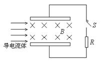 ,负载电阻为R,导电流体从一侧沿垂直磁场且与极板平行方向射入极板间,求: