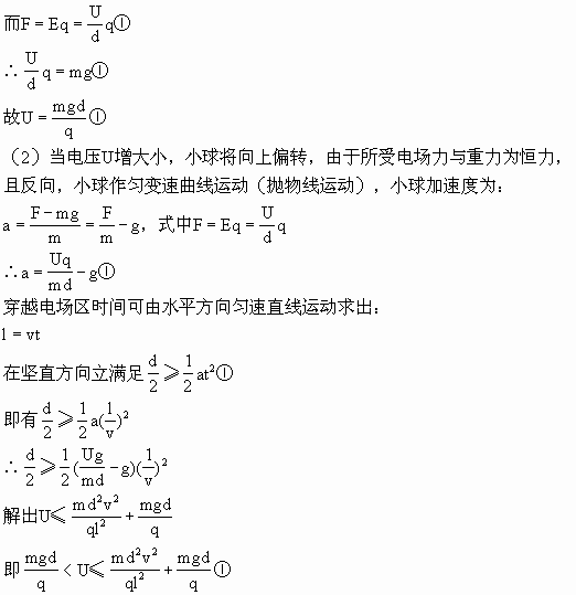 (2)如果所加电压U增大,但仍能使小球飞出两板间,求电压允许范围。