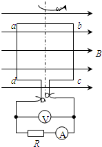 1、简答题 如图所示是一个交流发电机的示意图,线框abcd处于匀强磁场中,已知ab=bc=10cm,匀强磁场的磁感应强度B=1T,线圈的匝数N=100,线圈的总电阻r=5Ω,外电路负载电阻R=5Ω,线圈ω=20πrad/s,电表是理想电表,求: