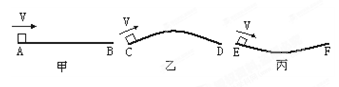 2、填空题 如图所示。AB为平面,CD、EF为一段圆弧,它们的长度相等;与小物块的动摩擦因数也相等。现使小物块分别从A、C、E三点以相同的速率沿图示方向出发,分别到达B、D、F三点。则到达 点的小物块速率最大,则到达 点的小物块速率最小。