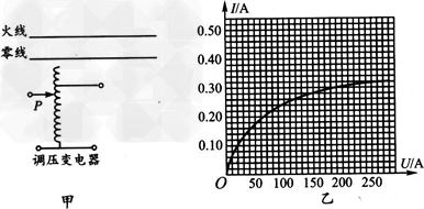 1、实验题  为了测定和描绘“220 V 60 W”白炽灯丝的伏安特性曲线,可以利用调压变压器供电,调压变压器是一种自耦变压器,它只有一组线圈,输入端接在220 V交流电源的火线与零线间,输出端有一个滑动触头P,移动它的位置,就可以使输出的电压在0~250 V之间连续变化,图甲画出的是调压变压器的电路符号,实验室内备有交流电压表、交流电流表、开关、导线等实验器材.?
