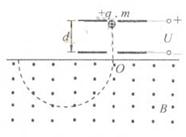 4、计算题 (10分)如图所示,两平行金属板间距为d,电势差为U,板间电场可视为匀强电场;金属板下方有一磁感应强度为B的匀强磁场。带电量为+q、质量为m的粒子,由静止开始从正极板出发,经电场加速后射出,并进入磁场做匀速圆周运动。忽略重力的影响,求:
