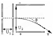 2、选择题 如图所示,电子在电势差为U1的加速电场中由静止开始运动,然后射入电势差为U2的两块平行板间的电场中,入射方向跟极板平行,整个装置处于真空中,重力可忽略.在满足电子能射出平行板的条件下,下述四种情况中,一定能使电子的偏角φ变大的是: