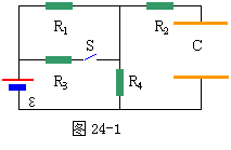 3、简答题 如图24-1所示,R1=R2=R3=R4=R,电键S闭合时,间距为d的平行板电容器C 的正中间有一质量为m,带电量为q的小球恰好处于静止状态;电键S断开时,小球向电容器一个极板运动并发生碰撞,碰撞后小球带上与极板同种性质的电荷。设碰撞过程中没有机械能损失,小球反弹后恰好能运动到电容器另一极板。若不计电源内阻,求:(1)电源的电动势,(2)小球与极板碰撞后的带电量。