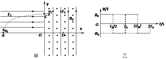 3、计算题 在竖直平面内建立一平面直角坐标系xoy,x轴沿水平方向,如图甲所示。第二象限内有一水平向右的匀强电场,场强为E1。坐标系的第一、四象限内有一正交的匀强电场和匀强交变磁场,电场方向竖直向上,场强