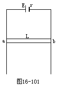 1、简答题  如图16-101所示,电源电动势E=2V,r=0.5Ω,竖直导轨宽L=0.2m,导轨电阻不计.另有一金属棒质量m=0.1kg、电阻R=0.5Ω,它与导轨间的动摩擦因数μ=0.4,靠在导轨的外面.为使金属棒不滑,施一与纸面夹角为30°且与导体棒垂直指向纸里的匀强磁场,(设最大静摩擦力等于滑动摩擦力,取g=10m/s2).求: