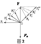 本题解析:选择O点为研究对象,受力分析如图2所示,由物体平衡的条件可知:拉力F1、F2的合力F与Fo(Fo=G)等大反向,即F竖直向上,大小不变,由于O点的位置不变,所以拉力F2方向不变,F1与水平方向的夹角逐渐增大,由平行四边形法则作出的图示很容易看出:OA绳的拉力F1先变小,后变大,OB绳的拉力F2逐渐减小.