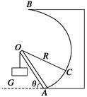 2、选择题 如图所示,有一质量不计的杆AO,长为R,可绕A自由转动。用绳在O点悬挂一个重为G的物体,另一根绳一端系在O点,另一端系在以O点为圆心的圆弧形墙壁上的C点。当点C由图示位置逐渐向上沿圆弧CB移动过程中(保持OA与地面夹角θ不变),OC绳所受拉力的大小变化情况是