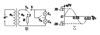 2、选择题 .图甲中理想变压器原、副线圈的匝数之比n1∶n2=5∶1,电阻R=20Ω,L1、L2为规格相同的两只小灯泡,S1为单刀双掷开关。原线圈接正弦交变电源,输入电压u随时间t的变化关系如图乙所示。现将S1接1、S2闭合,此时L2正常发光。下列说法正确的是