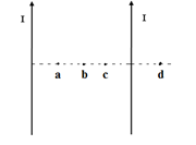 1、选择题  如图所示,两通电细直导线竖直放置,所通电流大小相等,方向都向上。在虚线所示的水平线上有a、b、c、d四点,其中b点位于两导线之间的中点,关于这四个点的磁感应强度方向描述正确的是(    )