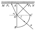 5、计算题 如图所示,为某种透明介质的截面图,△AOC为等腰直角三角形,BC为半径R=10 cm的四分之一圆弧,AB与水平屏幕MN垂直并接触于A点。由红光和紫光两种单色光组成的复色光射向圆心O,在AB分界面上的入射角i=45°,结果在水平屏幕MN上出现两个亮斑。已知该介质对红光和紫光的折射率分别为n1=