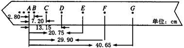 2、实验题 下图为“探究加速度与力、质量的关系”实验中用打点计时器打出的一条较理想的纸带,纸带上A、B、C、D、E、F、G为七个相邻的计数点,相邻计数点间的时间间隔为0.1 s,各计数点间距离如图中所示,单位是cm。则小车的加速度为____________m/s2。