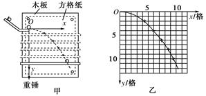 5、计算题 如图所示,某同学在做“研究平抛物体的运动”的实验中,在已知判定平抛运动在竖直方向上为自由落体运动后,再来用图甲所示实验装置研究水平方向上的运动.他先调整斜槽轨道使槽口末端水平,然后在方格纸(甲图中未画出方格)上建立直角坐标系xOy,将方格纸上的坐标原点O与轨道槽口末端重合,Oy轴与重垂线重合,Ox轴水平.实验中使小球每次都从斜槽同一高度由静止滚下,经过一段水平轨道后抛出.依次均匀下移水平挡板的位置,分别得到小球在挡板上的落点,并在方格纸上标出相应的点迹,再用平滑曲线将方格纸上的点迹连成小球的运动轨道如图乙所示.已知方格边长为L,重力加速度为g.