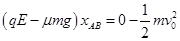 5、计算题 在粗糙的水平地面上,有一小滑块,质量为m=1 kg,带正电荷,带电量为q=10-3C,整个空间充满着水平向右的匀强电场,电场强度为E=3×103 N/C,滑块与地面间的动摩擦因数μ=0.4。在地面A处,滑块开始以水平向右的初速度v0=2 m/s向右滑动,最后在B处停下,重力加速度取g=10m/s2,求: