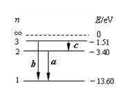 3、选择题 氢原子能级图如图所示,a,b,c分别表示原子在不同能级之间的三种跃迁途径,设在a,b,c在跃迁过程中,放出光子的能量和波长分别是