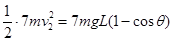 4、计算题 如图所示,一砂袋用无弹性轻细绳悬于O点.开始时砂袋处于静止状态,此后用弹丸以水平速度击中砂袋后均未穿出。第一次弹丸的速度为v0,打入砂袋后二者共同摆动的最大摆角为θ(θ<90°),当其第一次返回图示位置时,第二粒弹丸以另一水平速度v又击中砂袋,使砂袋向右摆动且最大摆角仍为θ.若弹丸质量均为m,砂袋质量为5m,弹丸和砂袋形状大小忽略不计,求:两粒弹丸的水平速度之比为多少?