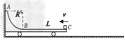 5、计算题 如图所示,水平光滑地面上停放着一辆小车,左侧靠在竖直墙壁上,小车的四分之一圆弧轨道AB光滑,在最低点B与水平轨道BC相切,BC的长度L=2m,圆弧半径R=1m,整个轨道处于同一竖直平面内。可视为质点的物块从C点以8m/s初速度向左运动,物块与BC部分的动摩擦因数μ=0.7,已知物块质量为m=1kg,小车的质量M=3.5kg。(g=10m/s2)求: