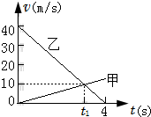 4、选择题 甲、乙两物体在同一直线上运动,它们在0~4s时间内的v-t图象如图所示.若仅在两物体之间存在相互作用,则物体甲与乙的质量之比和图中时间t1分别为( )
