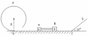 4、简答题 如图所示,质量分别为m和M的滑块A和B静止于光滑的水平台面上,A和B之间夹有一轻质弹簧(A、B与弹簧不连接),弹簧处于被压缩状态,有一轻质绳连接着A和B。水平台面左端连接着一半径为R=0.2m的光滑圆轨道PQ,右端为一倾角为37°的足够长的斜面CD,滑块B与斜面CD间的动摩擦因数为。烧断两滑块间的轻质绳后,由于弹簧弹力的作用,滑块A将沿圆轨道做圆周运动,且在最高点P轨道对滑块的压力恰好等于滑块的重力。已知两滑块的质量之比为
