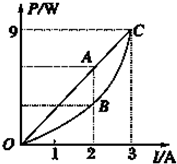 3、选择题 如图所示的两条图线分别表示同一电源的内阻发热功率Pr以及电源的总功率P随干路电流I的变化图线,其中抛物线OBC为电源的内阻发热功率Pr随干路电流I的变化图线,直线OAC为电源的总功率P随干路电流I的变化图线.若线段AB对应的横坐标为2A,那么图象中线段AB所表示的功率差以及电流I=2A时所对应的外电阻分别为( )