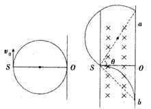 1、计算题 S为电子源,它只在下图所示的纸面上360°范围内发射速率相同、质量为m、电荷量为e的电子,MN是一块足够大的竖直挡板,与S的水平距离OS=L。挡板左侧有垂直纸面向里的匀强磁场,磁感应强度为B,求: