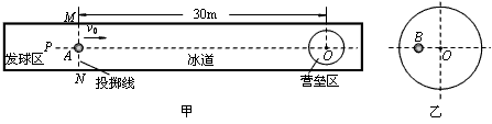 冰壶比赛的场地如图甲所示。冰道的左端有一个发球区,运动员在发球区边沿的投掷线MN将冰壶以一定的初速度掷出,使冰壶沿着冰道的中心线PO滑行,冰道的右端有一圆形的营垒。以场地上冰壶最终静止时距离营垒圆心O的远近决定胜负。比赛时,为使冰壶滑行得更远,运动员可以用毛刷擦冰壶运行前方的冰面,使冰壶与冰面间的动摩擦因数减小。当对手的冰壶停止在营垒内时,可以用掷出的冰壶与对手的冰壶撞击,使对手的冰壶滑出营垒区。已知冰壶的质量为20kg,营垒的半径为1.8m。设冰壶与冰面间的动摩擦因数μ1=0.008,用毛刷擦冰面后动摩擦因数减小至μ2=0.004。在某次比赛中,若冰壶在发球区受到运动员沿中心线方向推力作用的时间t=10s,使冰壶A在投掷线中点处以v0=2.0m/s的速度沿中心线PO滑出。设冰壶之间的碰撞时间极短,且无机械能损失,不计冰壶自身的大小,g取10m/s2。