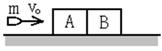 2、计算题  (10分)如图所示在水平地面上放置质量均为M=400g的木块A和B,一质量为m=50g的子弹以水平速度V0=100m/s射入木块A,当子弹穿出A时,速度V1=80m/s,子弹未穿出木块B,若木块与地面间的动摩擦因数均为μ=0.2。 ( g= 10m/s2)