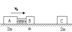 1、计算题  (09·山东·38)(2)如图所示,光滑水平面轨道上有三个木块,A、B、C,质量分别为mB=mc=2m,mA=m,A、B用细绳连接,中间有一压缩的弹簧 (弹簧与滑块不栓接)。开始时A、B以共同速度v0运动,C静止。某时刻细绳突然断开,A、B被弹开,然后B又与C发生碰撞并粘在一起,最终三滑块速度恰好相同。求B与C碰撞前B的速度。