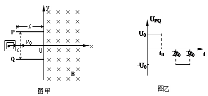 4、计算题 如图甲所示,建立x0y坐标系,两平行极板P、Q垂直于y轴且关于x轴对称,极板长度和板间距均为L,第Ⅰ、Ⅳ象限分布着匀强磁场,方向垂直于x0y平面向里。位于极板左侧的粒子源可沿x轴向右发射质量为m、电量为q、速度相同、重力不计的带正电粒子。在0~3t0时间内两极板所加电压如图乙所示。已知,若粒子在t=0时刻射入,将恰好在t0时刻经极板边缘射入磁场。上述m、q、L、t0为已知量,且忽略粒子间的相互影响。求: