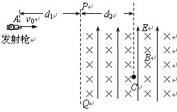2、计算题 (15分)如图所示,竖直平面内,直线PQ右侧足够大的区域内存在竖直向上的匀强电场和垂直于纸面向里的匀强磁场,左侧到直线距离为d1=0.4m的A处有一个发射枪。发射枪将质量m=0.01kg,带电量q= +0.01C的小球以某一初速度v0水平射出,当竖直位移为d1/2时,小球进入电磁场区域,随后恰能做匀速圆周运动,且圆周最低点C(图中运动的轨迹未画出)到直线PQ的距离为d2=0.8m.不计空气阻力,g取10m/s2。试求: