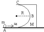 3、计算题 如图所示,质量M,半径R的光滑半圆槽第一次被固定在光滑水平地面上,质量为m的小球,以某一初速度冲向半圆槽刚好可以到达顶端C.然后放开半圆槽,其可以自由运动,m小球又以同样的初速冲向半圆槽,小球最高可以到达与圆心等高的B点,(g=10m/s2)试求: