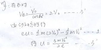 5、计算题 如图所示,电子以速度v0沿与电场垂直的方向从A点飞入匀强电场,并且从另一侧的B点沿与电场成150°角的方向飞出,已知电子的质量为m,电荷量为e,求A、B两点的电势差.