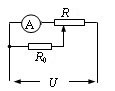 4、简答题 如图所示,电路中R0为定值电阻,R为滑动变阻器,其总电阻为R,当在电路两端加上恒定电压U,移动R的滑动触片,求电流表的示数变化范围。