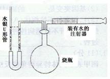 1、计算题 (9分)如图所示,一定质量的气体温度保持不变,最初,U形管两臂中的水银相齐,烧瓶中气体体积为800ml;现用注射器向烧瓶中注入200ml水,稳定后两臂中水银面的高度差为25. 3cm;已知76cm高的水银柱产生的压强约为l.0×105Pa,不计U形管中气体的体积。