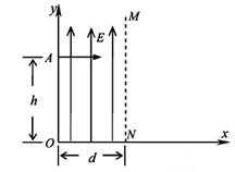 5、计算题  如图所示,在空间中取直角坐标系Oxy,在第一象限内平行于y轴的虚线MN与y轴距离为d,从y轴到MN之间的区域充满一个沿y轴正方向的匀强电场,场强大小为E。静止的电子经过另一个电势差为U的电场加速后,从y轴上的A点以平行于x轴的方向射入第一象限区域,A点坐标为(0,h)。已知电子的电量为e,质量为m,加速电场的电势差U>,电子的重力忽略不计,求: