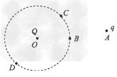 5、选择题 如图所示,在O点置一点电荷Q,以O为圆心作一圆现将一电荷q从A分别移到圆上的B、C、D三点,则电场力做功最多的过程是