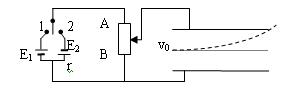 3、计算题 一电子经过加速电场加速后沿中线进入两平行金属板间,在板间被电场力作用产生偏转。已知加速电压U1=100V,平行金属板长度为L=20cm,板间距离d=6cm。偏转电压由如图所示电路提供,滑动变阻器总电阻为20Ω,当开关拔至1、滑动触头拔至中央时,发现电子刚好能从上极板边缘飞出。已知电源E1无内阻,E2=10.8V,内阻r=4Ω。现要使电子刚从下极板边缘飞出,可把开关拔至2,并调节滑动触头达到目的。求: