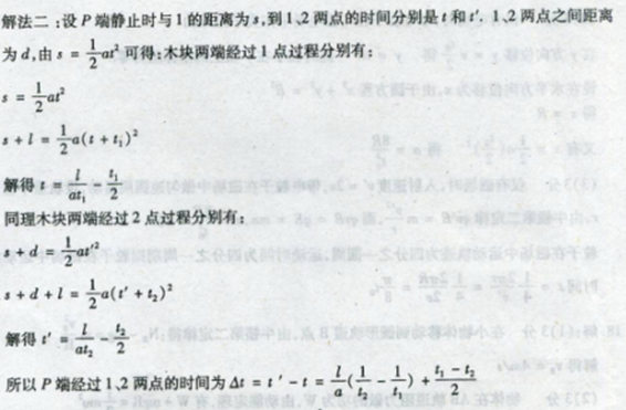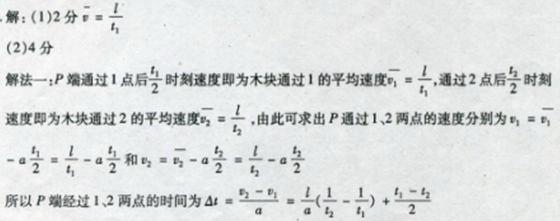 5、计算题 如图,一长为L的长方形木块在水平面上以加速度a做匀加速直线运动.先后经过l、2两点,l、2之间有一定的距离,木块通过l、2两点所用时间分别为t1和t2。