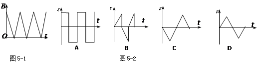 2、选择题  一闭合导线环垂直于匀强磁场,若磁感应强度随时间变化规律如图5-1所示,则环中的感应电动势变化情况是图5-2中的(?)