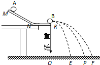 5、简答题 某同学采用如图所示的装置来验证动量守恒定律.图中MN是斜槽,NR为水平槽.实验时先使A球从斜槽上某一固定位置由静止开始滚下,落到位于水平地面的记录纸上,留下痕迹.重复上述操作10次,得到10个落点痕迹平均位置P;再把B球放在水平槽上靠近槽末端的地方,让A球仍从固定位置由静止开始滚下,与B球碰撞后,A、B球分别在记录纸上留下各自的落点痕迹.重复这种操作10次得到10个落点痕迹平均位置E、F.