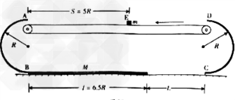 3、计算题 如图所示,以A、B和C、D为端点的两半圆形光滑轨道固定于竖直平面内,一滑板静止在光滑水平面上,左端紧靠B点,上表面所在平面与两半圆分别相切于B、C。一物块被轻放在水平匀速运动的传送带上E点,运动到A时刚好与传送带速度相同,然后经A沿半圆轨道滑下,再经B滑上滑板.滑板运动到C时被牢固粘连。物块可视为质点,质量为m,滑板质量M=2m,两半圆半径均为R,板长ι=6.5R,板右端到C的距离L在R<L<5R范围内取值,E距A为S=5R,物块与传送带、物块与滑板间的动摩擦因数均为μ=0.5,重力加速度取g.