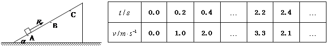 4、计算题 (14分)如图所示,一光滑斜面固定在水平地面上,质量m=1kg的物体在平行于斜面向上的恒力F作用下,从A点由静止开始运动,到达B点时立即撤去拉力F.此后,物体到达C点时速度为零。每隔0.2s通过传感器测得物体的瞬时速度,下表给出了部分测量数据。求: