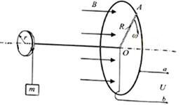 2、计算题 (20分)其同学设计一个发电测速装置,工作原理如图所示。一个半径为R=0.1m的圆形金属导轨固定在竖直平面上,一根长为R的金属棒OA,A端与导轨接触良好,O端固定在圆心处的转轴上。转轴的左端有一个半径为r=R/3的圆盘,圆盘和金属棒能随转轴一起转动。圆盘上绕有不可伸长的细线,下端挂着一个质量为m=0.5kg的铝块。在金属导轨区域内存在垂直于导轨平面向右的匀强磁场,磁感应强度B=0.5T。a点与导轨相连,b点通过电刷与O端相连。测量a、b两点间的电势差U可算得铝块速度。铝块由静止释放,下落h=0.3m时,测得U=0.15V。(细线与圆盘间没有滑动国,金属棒、导轨、导线及电刷的电阻均不计,重力加速度g=10m/s2)